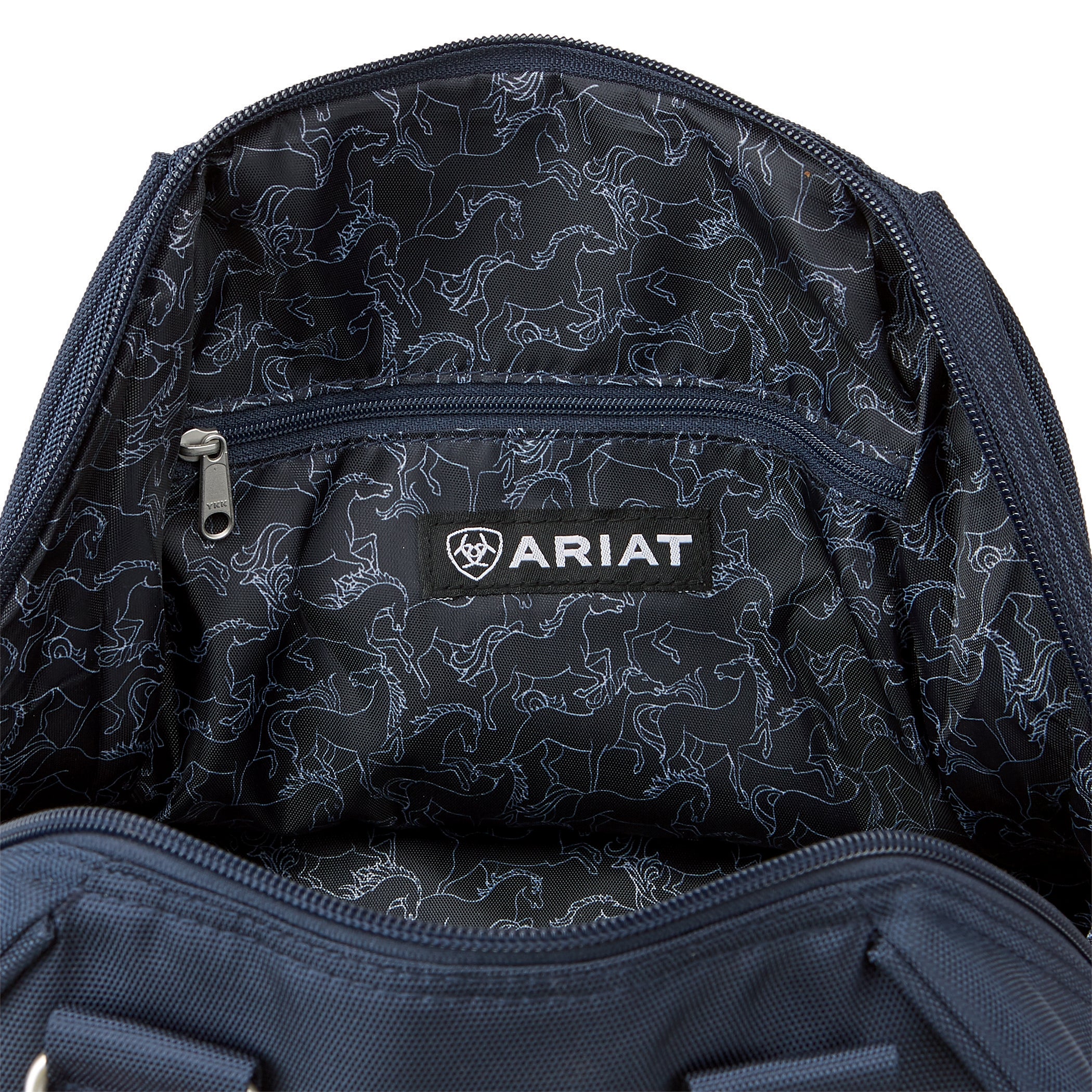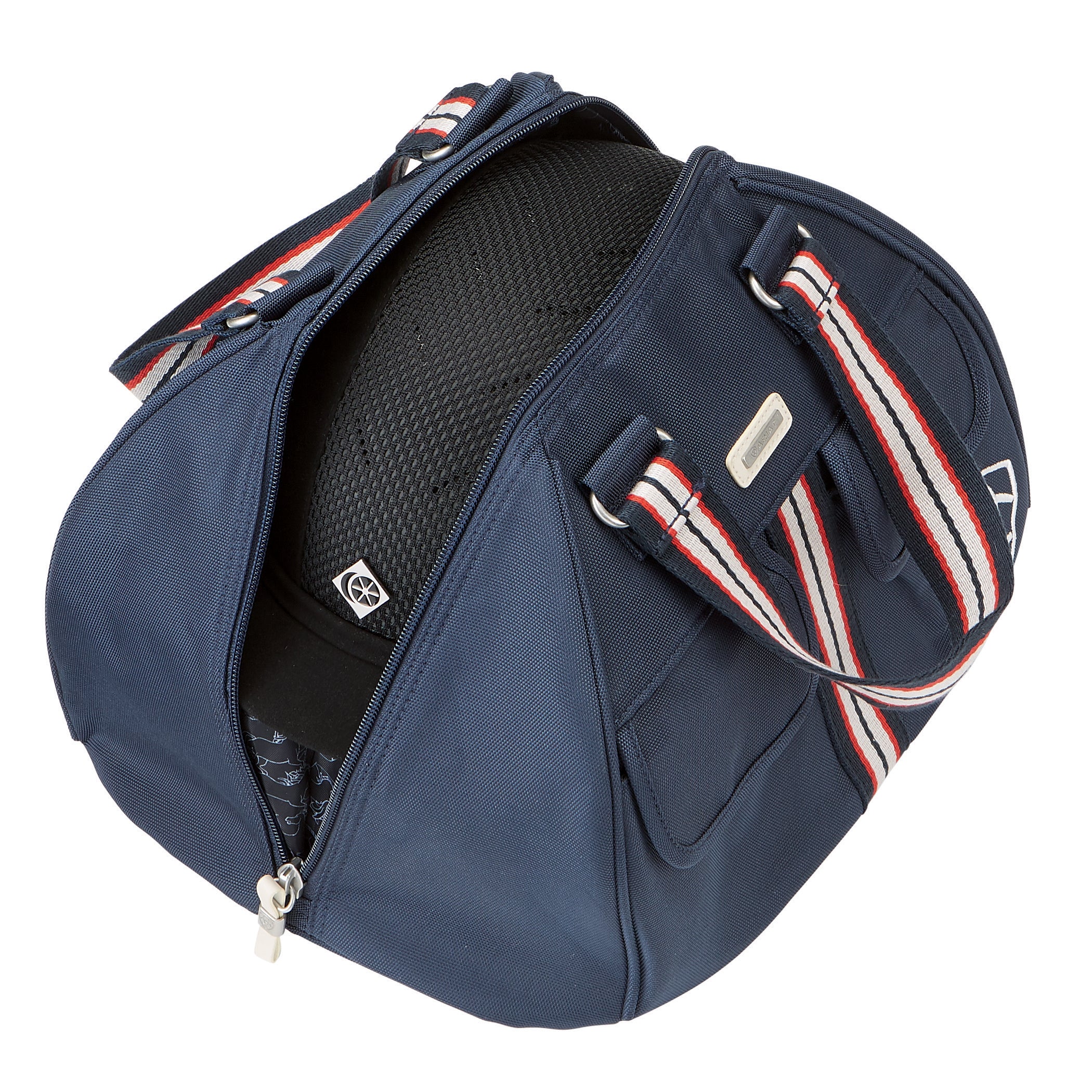 Store your helmet in the freshly updated Ariat® Team Helmet Bag! This popular design has a convenient double zipper opening for easy filling. Two exterior pockets with magnetic closures and an interior zip pocket offer plenty of storage for hairnets, stock pins, gloves or other little accessories. Lined in an attractive equestrian print and complete with comfortable web carry straps. 10"H x 12"W x 10"D at base.