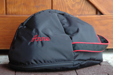 The Custom Fleeced-Lined Hat Bag by Tally Ho fits helmets and hunt caps from every ASTM/SEI helmet manufacturer. Made of nylon and lined with black, plush fleece to protect against scuffs, this helmet bag zips closed and has a convenient carrying handle. Choose your bag color and trim color. A monogram adds a nice personal touch! Allow 4-6 weeks for delivery.