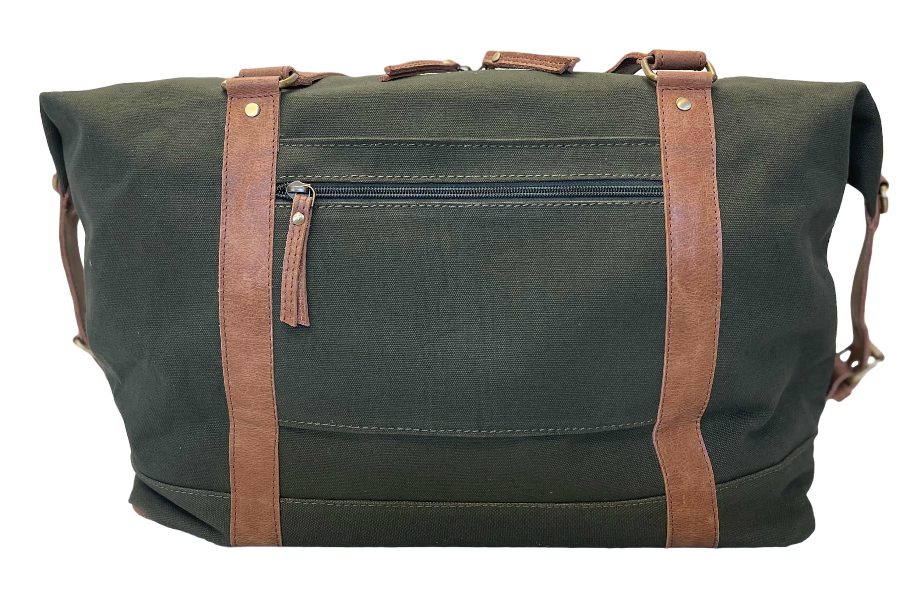 Tucker Tweed Equestrian™ Barn Duffle made with garment-dyed heavy duty canvas, featuring two-tone, eco-friendly remnant leather accents. Responsibly and resourcefully made by hand, this is the perfect duffle to pair with the barn bag. Generous in size, this overnight option is ideal for show season or a weekend away. Durable and practical with reinforced stitching with an interior zip pocket, adjustable and removable shoulder strap and an exterior pocket located on our "trolley" sleeve to attach easily to rolling luggage.