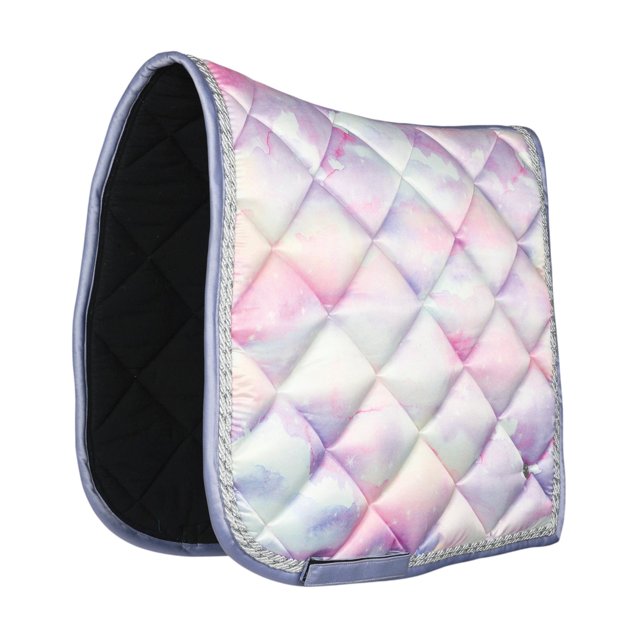 This Dapplebay Lavender Haze Dressage Saddle Pad captures the magic of early morning light and the soft glow of stardust. The ethereal blend of hues and celestial details reflect the song’s sense of escape and enchantment. Created exclusively in-house by founder and designer, Leah, this one-of-a-kind design is a true work of art—you won’t find it anywhere else! Not only are these pads beautiful to look at, but they are impeccably crafted by our manufacturing partner. No detail has gone overlooked. 22" drop; 24" spine.