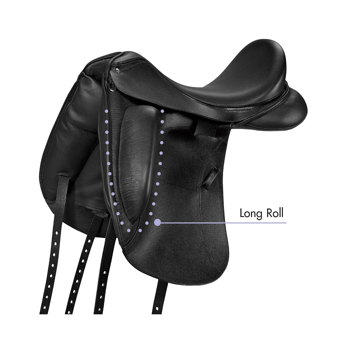 The seat and slightly tapered cantle put you in the correct position while providing comfort for your back and damping the bounce of your ride. The narrow twist is appealing to a variety of body shapes. An anatomically shaped wood spring tree with open pommel is excellent for fitting average to high-withered horses. With either long or short external knee rolls, this dressage saddle gently guides your legs with comfort, control and perfect balance for optimal communication between you and your horse. 100% natural imported wool flocked panels. Arrives with a saddle cover.