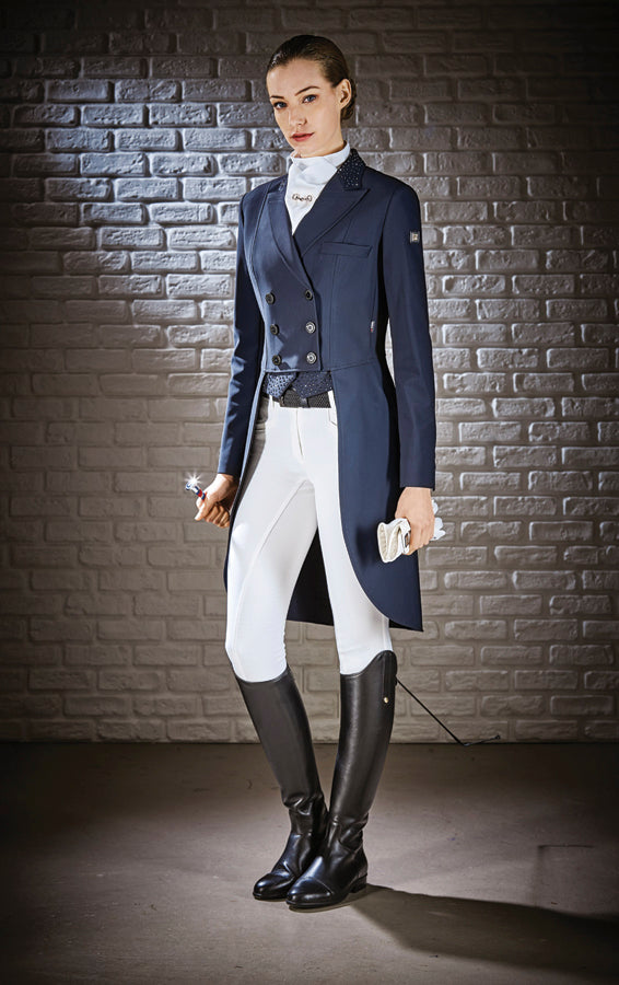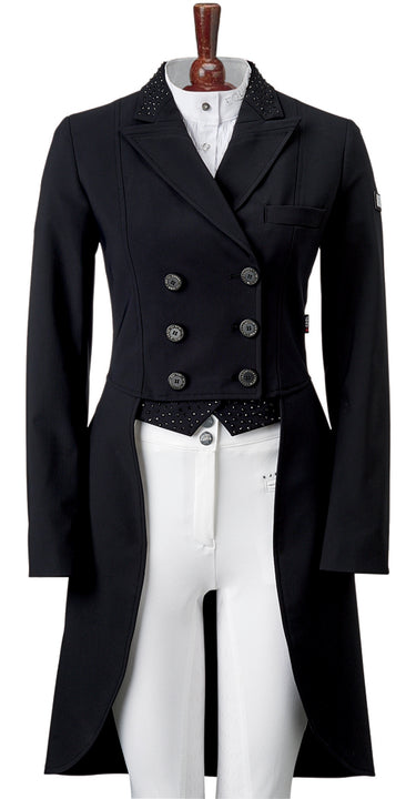 Beautiful and stylish, the Equiline Marilyn Shadbelly is made for performance. X-Cool Evo technical fabric is extremely elastic and abrasion, stain and water resistant. Adjustable weights in tails allow customization. Collar back and points have faceted crystals, matching the coat color and adding subtle elegance. Crystal elements on the buttons create a stunning effect.