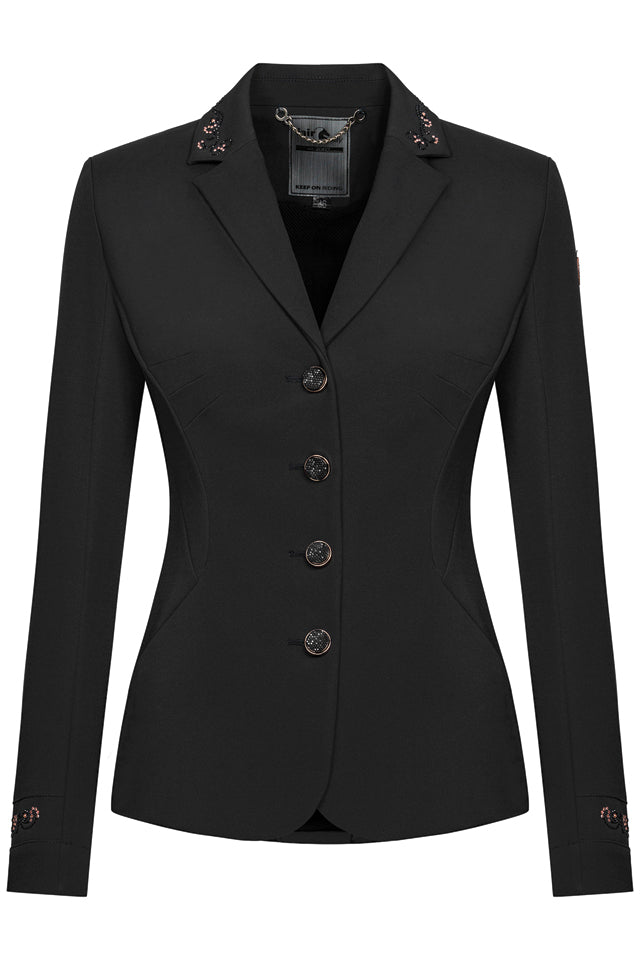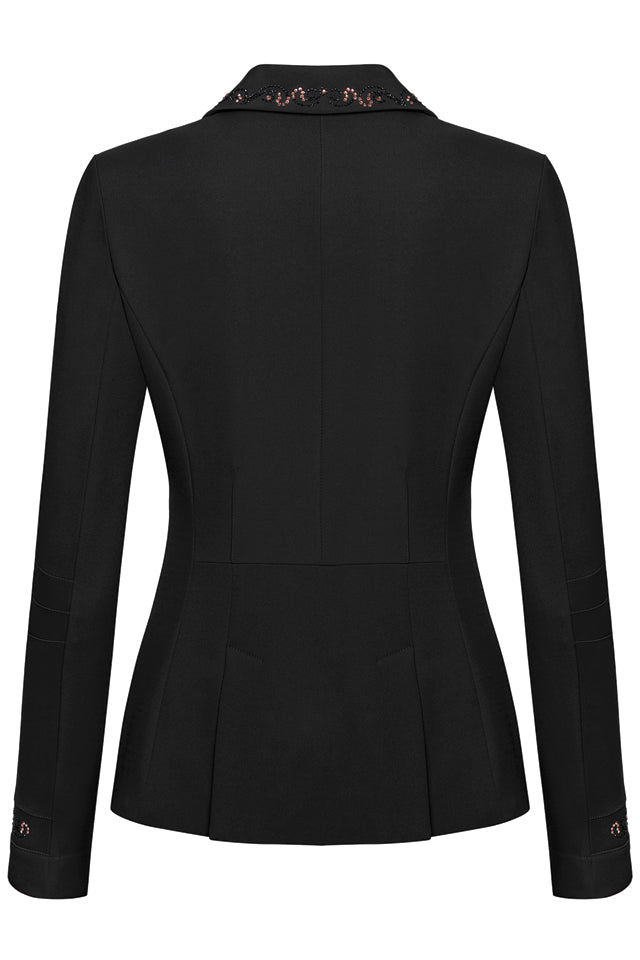 The Taylor Chic Show Coat is crafted in Poland and lined with a highly breathable mesh. Discreet eyelets under the armpits let heat escape, while rose gold and tonal crystals accent the collar and cuffs.