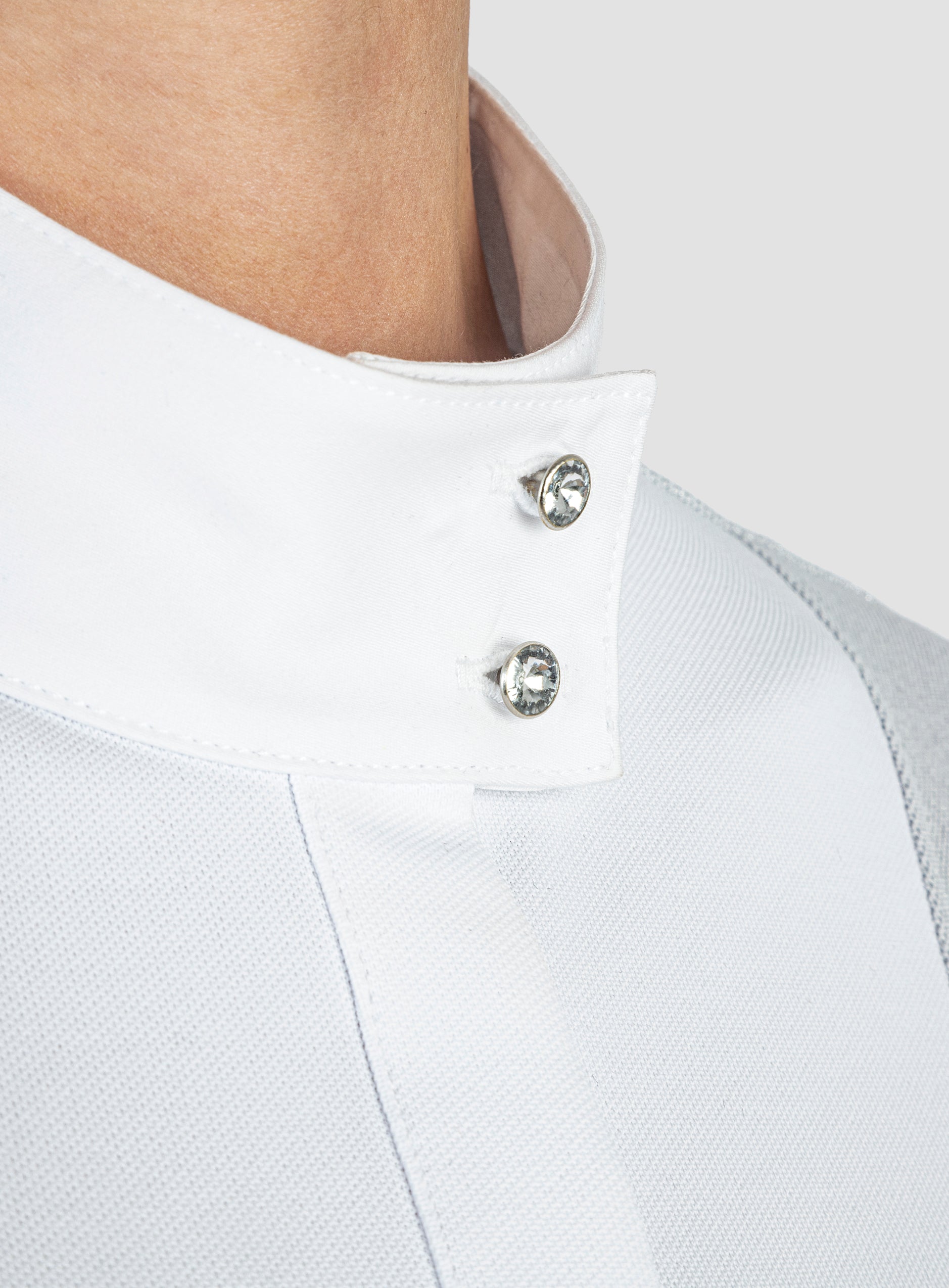 The Equiline Ladies’ Gardeg Long Sleeve Show Shirt offers breathability to keep you cool and stretch for freedom of motion. Cut to provide a feminine fit, it presents a polished look under a show jacket with crisp white poplin bib, collar with crystal-button closure and matching cuffs with logo embroidery.