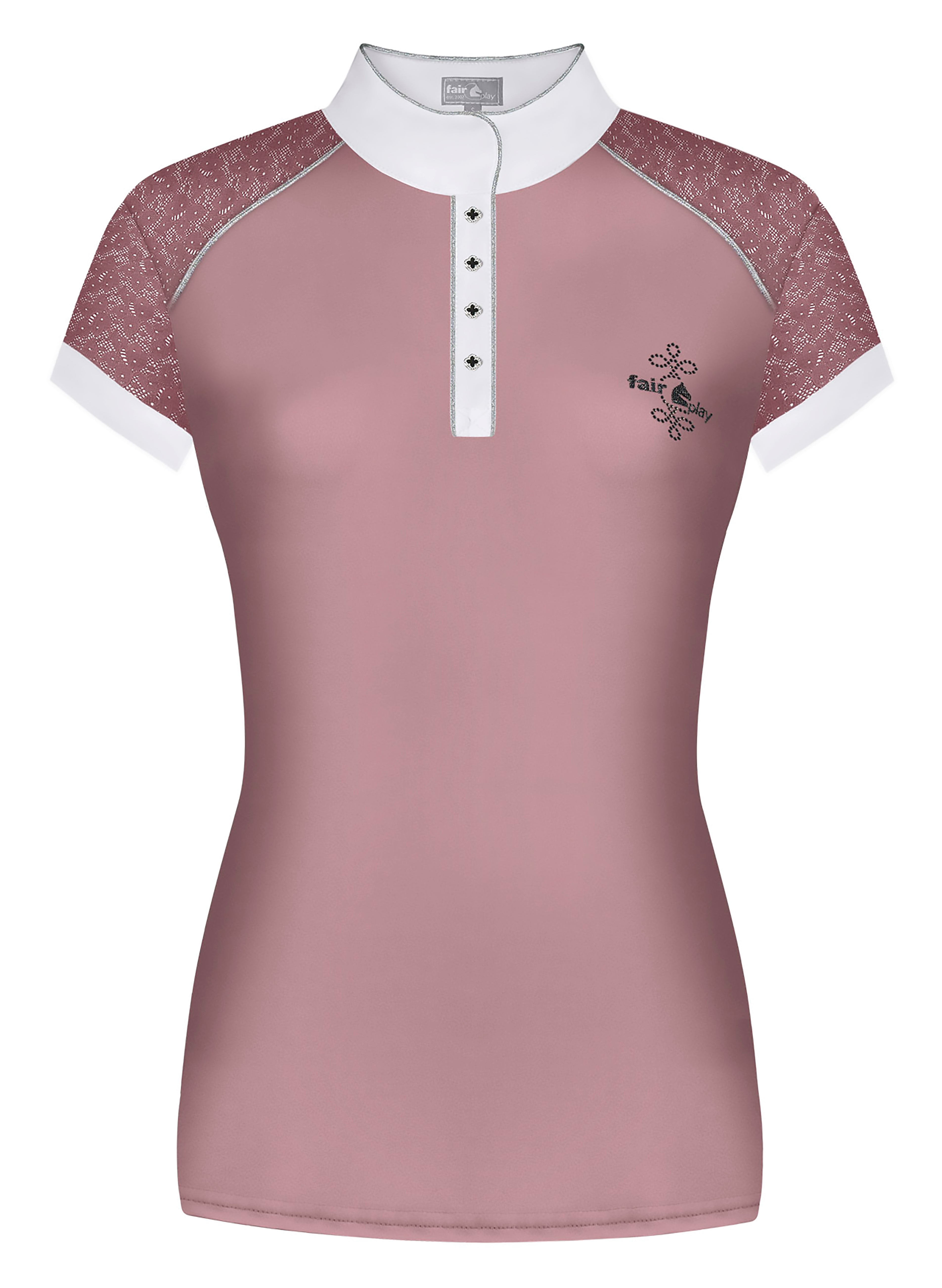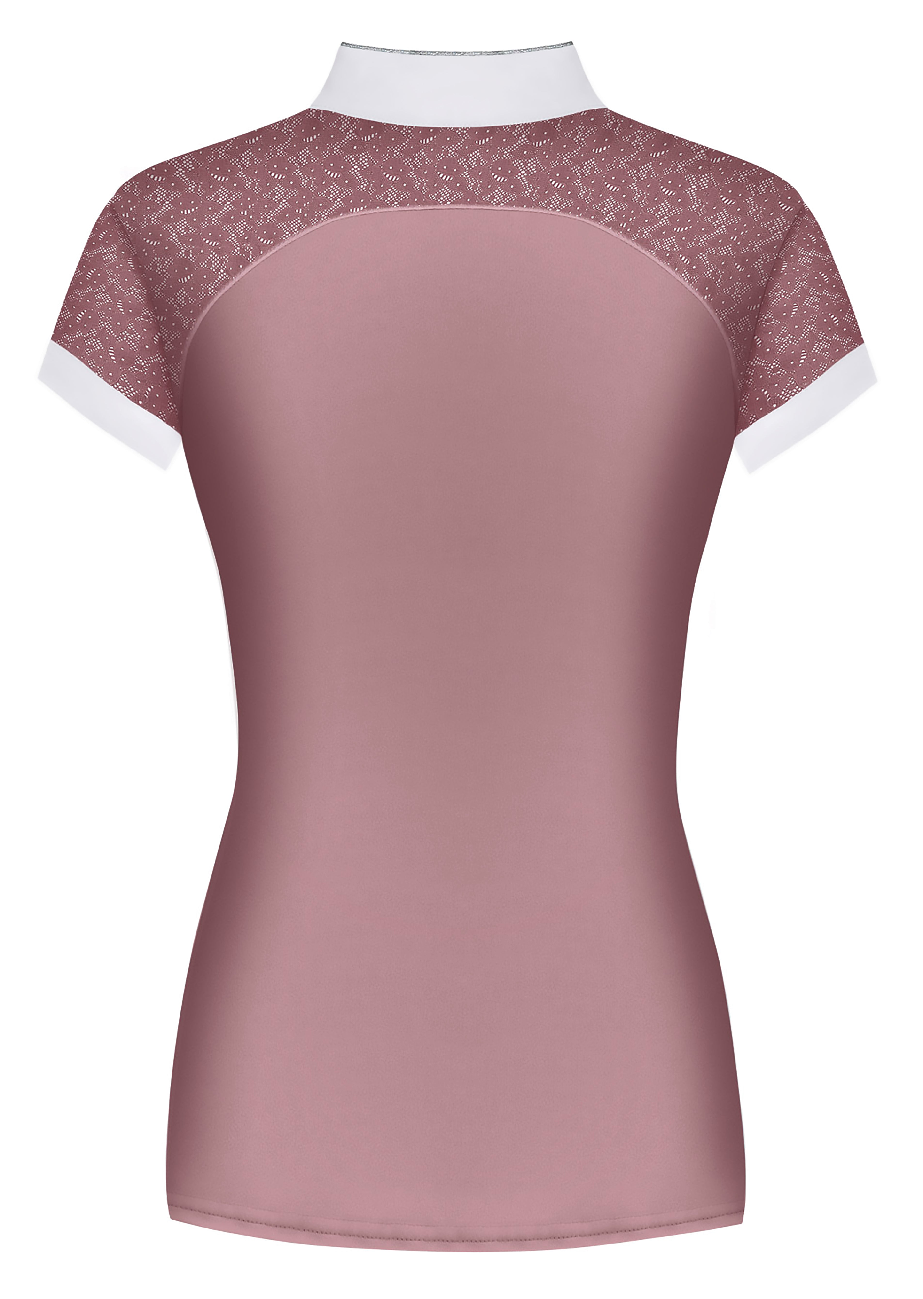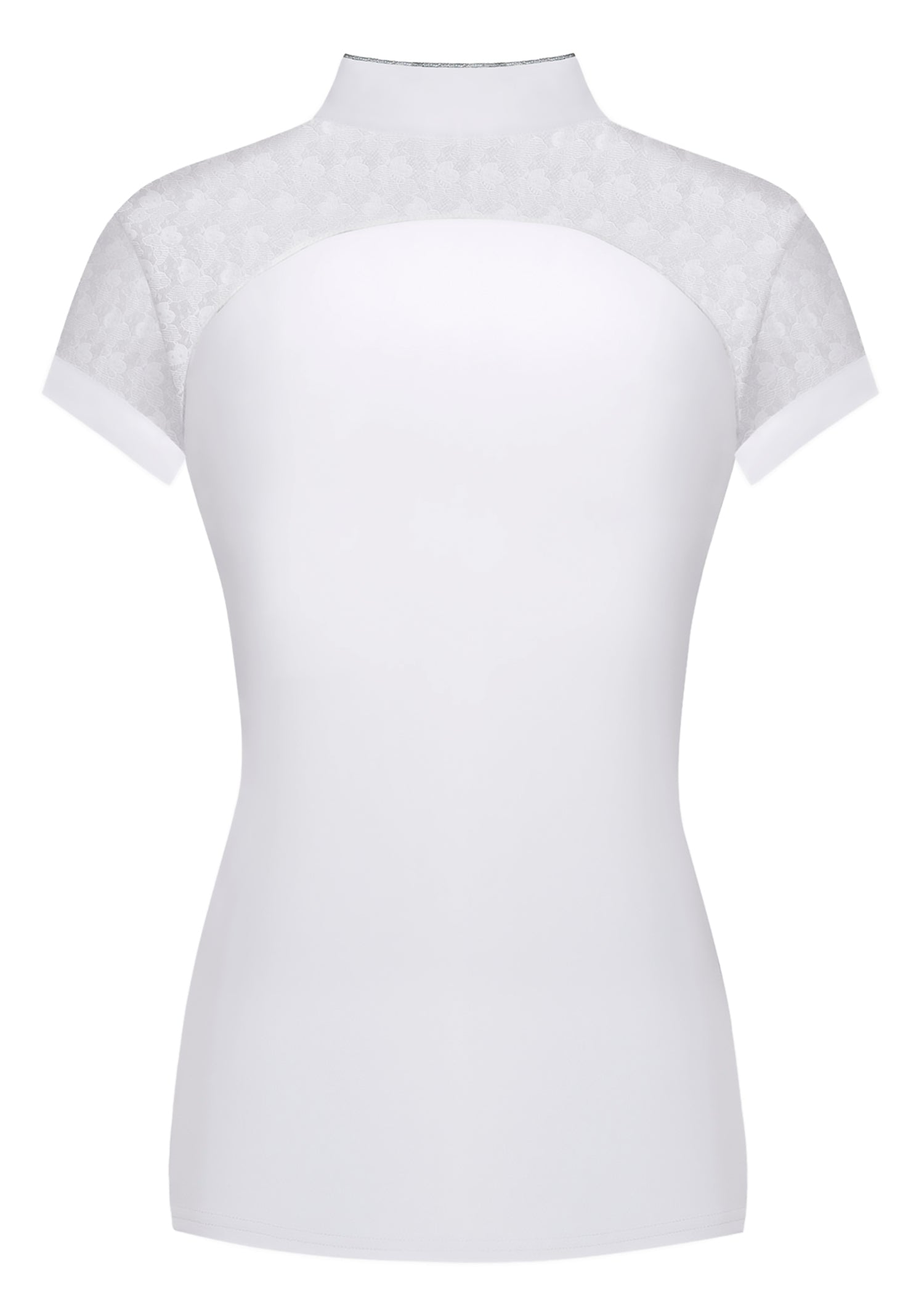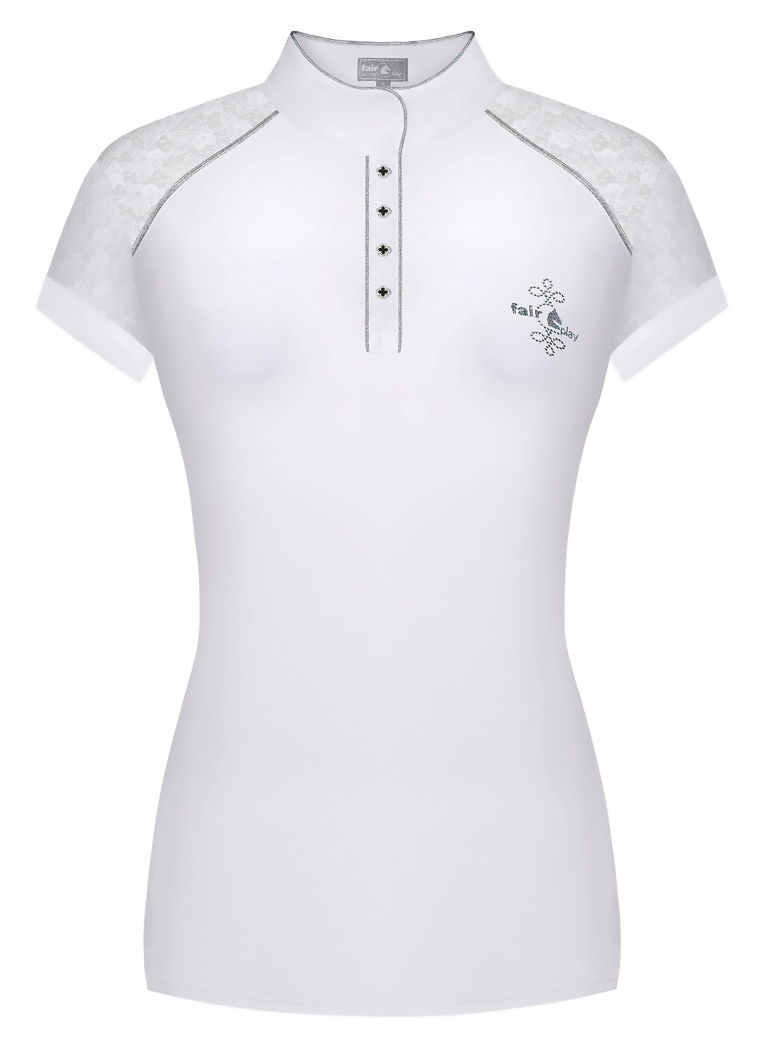 Elastic lace on the sleeves and front and back shoulders is a feminine touch that also adds airflow. Shimmering piping trims the collar, four-button placket and front shoulders. This competition top is proudly made in Poland and suited for formal lessons and clinics as well as shows.
