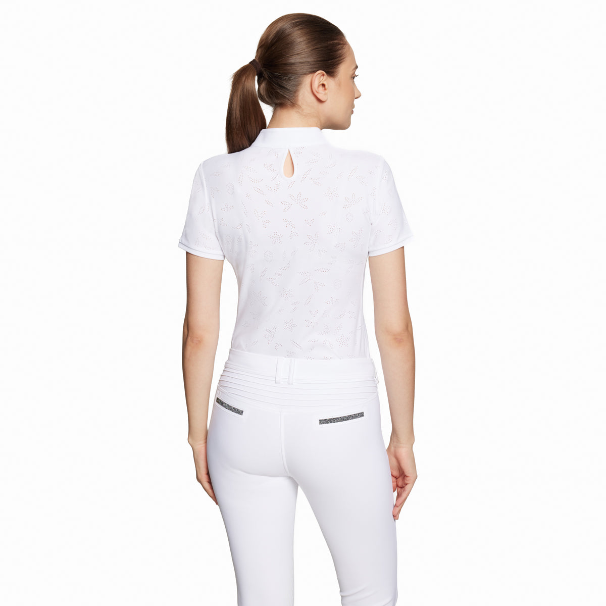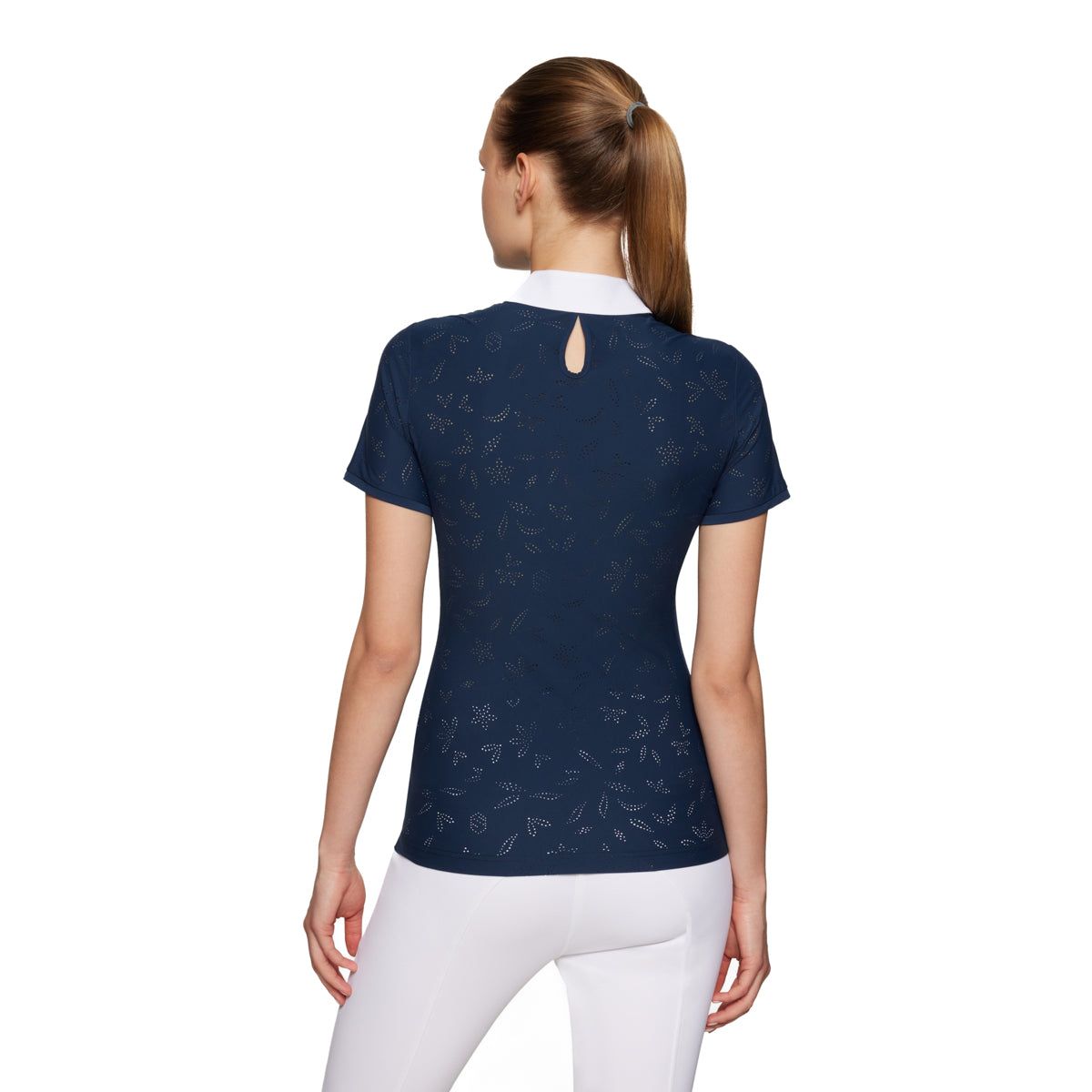 Beautiful flower perforations on the Samshield® Ladies’ Aloise Air Short-Sleeve Show Shirt add breathability and style. Extremely comfortable, quick-dry fabric has high stretch and is wrinkle free. UPF 50+ protection for summer riding. Crystal detail on placket conceals a zipper underneath. Flower perforations on the sleeves and side panels and back allow for additional ventilation without being see through.