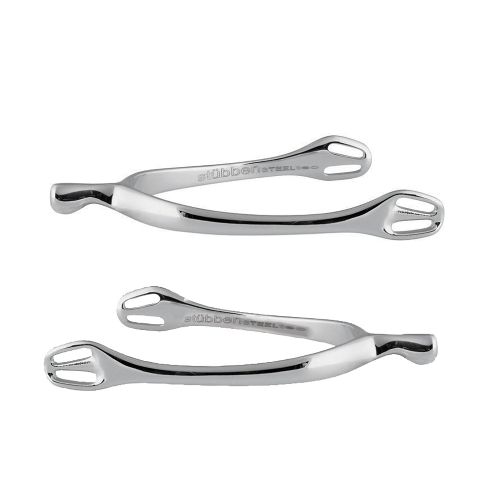 Stübben Steeltec Dynamic Spurs are made from a flexible stainless steel to fit both men and women. A V-shaped heel fits snugly while the offset spur strap loops help to alleviate ankle bone pressure. Made with Stubben’s signature quality and great for schooling or show. 25mm neck. Pair.