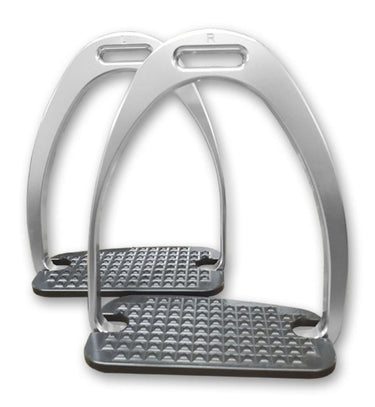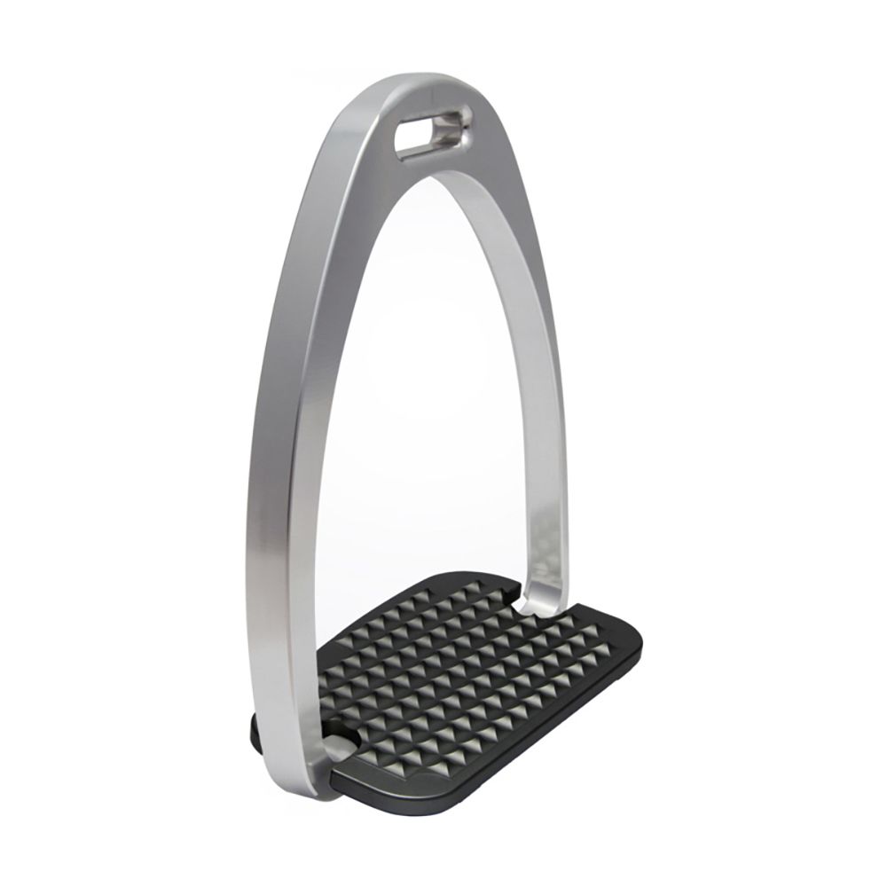 Stübben STEELtec Maxi Grip Stirrups in lightweight aluminum have wide, ergonomically shaped, grated footbeds to provide grip and added security. Branch is also slightly angled to help the rider keep foot and leg in the ideal position. Silver. Pair.