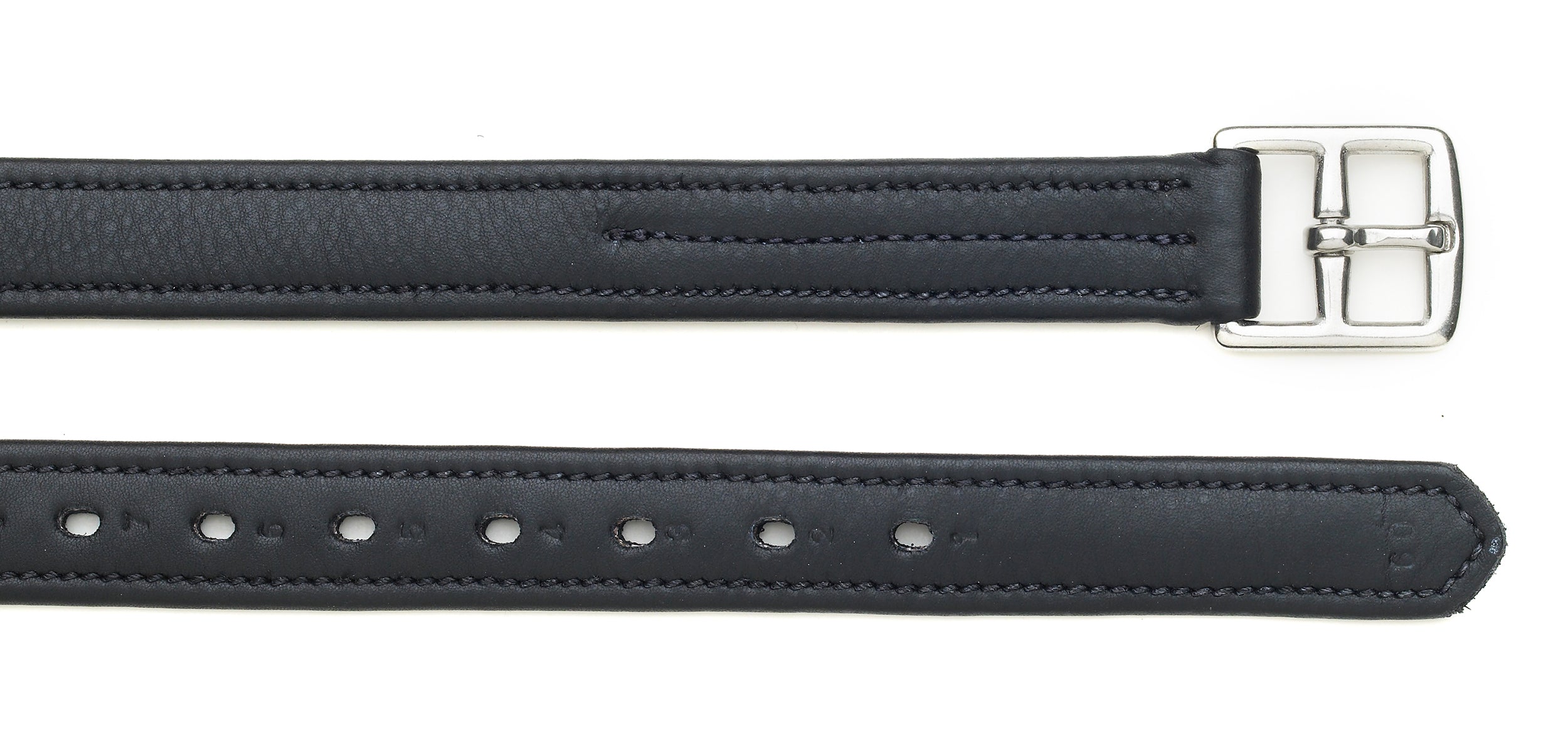 Ovation® Triple-Covered Dressage Leathers are biothane lined to reduce stretching. They feature a flat clasp on the top and special curved buckles designed to lay flat under the leg and reduce bulk. 1/2" spaced holes. Black.