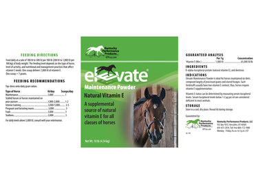 Elevate® Maintenance Powder from Kentucky Performance Products provides horses with a natural, highly bioavailable source of vitamin E. Vitamin E is required by horses for proper muscle and nerve function as well as immune system support. It is also a powerful antioxidant that works to limit damage cause by everyday oxidative stress. Vitamin E cannot be synthesized by horses, and therefore, it is considered an essential nutrient to be consumed. Fresh green grass is a source of natural vitamin E, but many horses do not have adequate access to grass in order to consume enough of the nutrient. Equine athletes, breeding stock and horses with certain muscular disorders may require supplemental vitamin E. Hardworking horses that lack adequate stores of vitamin E may experience muscle soreness or stiffness during exercise or suffer prolonged recovery times after strenuous work. An economical way to meet your horse’s essential vitamin E needs, this supplement contains only vitamin E; dosing can be adjusted without concern over causing an imbalance in another vitamin or nutrient. It provides 1,000 IU per scoop, included. 10 lb (647 scoops).