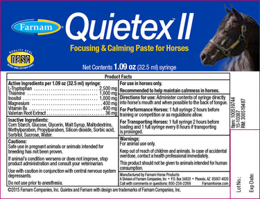 With a unique combination of stress-relieving ingredients, Farnam® Quietex II™ Focusing & Calming Paste helps keep horses calm, focused yet alert during training. This calming supplement is ideal to use for stressful situations, such as trailering or veterinary visits, and it won't cause drowsiness or impede performance. Administer entire contents of tube two hours prior to stressful event. Active ingredients: L-tryptophan, thiamine, inositol, magnesium, vitamin B6, valerian root extract. 32.5 ml single dose oral syringe.
