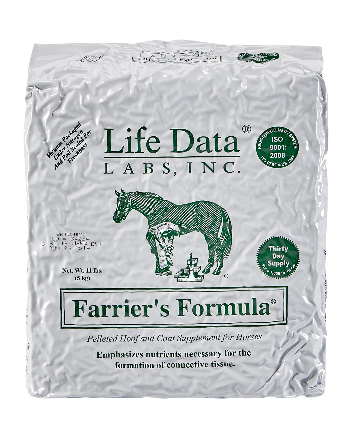Farrier’s Formula® is a pelleted hoof supplement for horses. It can be added as a top dressing on regular feed or given separately. Farrier’s Formula provides nutrients such as phospholipids, omega fatty acids, vitamins, minerals and key amino acid “protein building blocks”. These nutrients help horses build strong connective tissue proteins important for healthy hoof structure and growth.