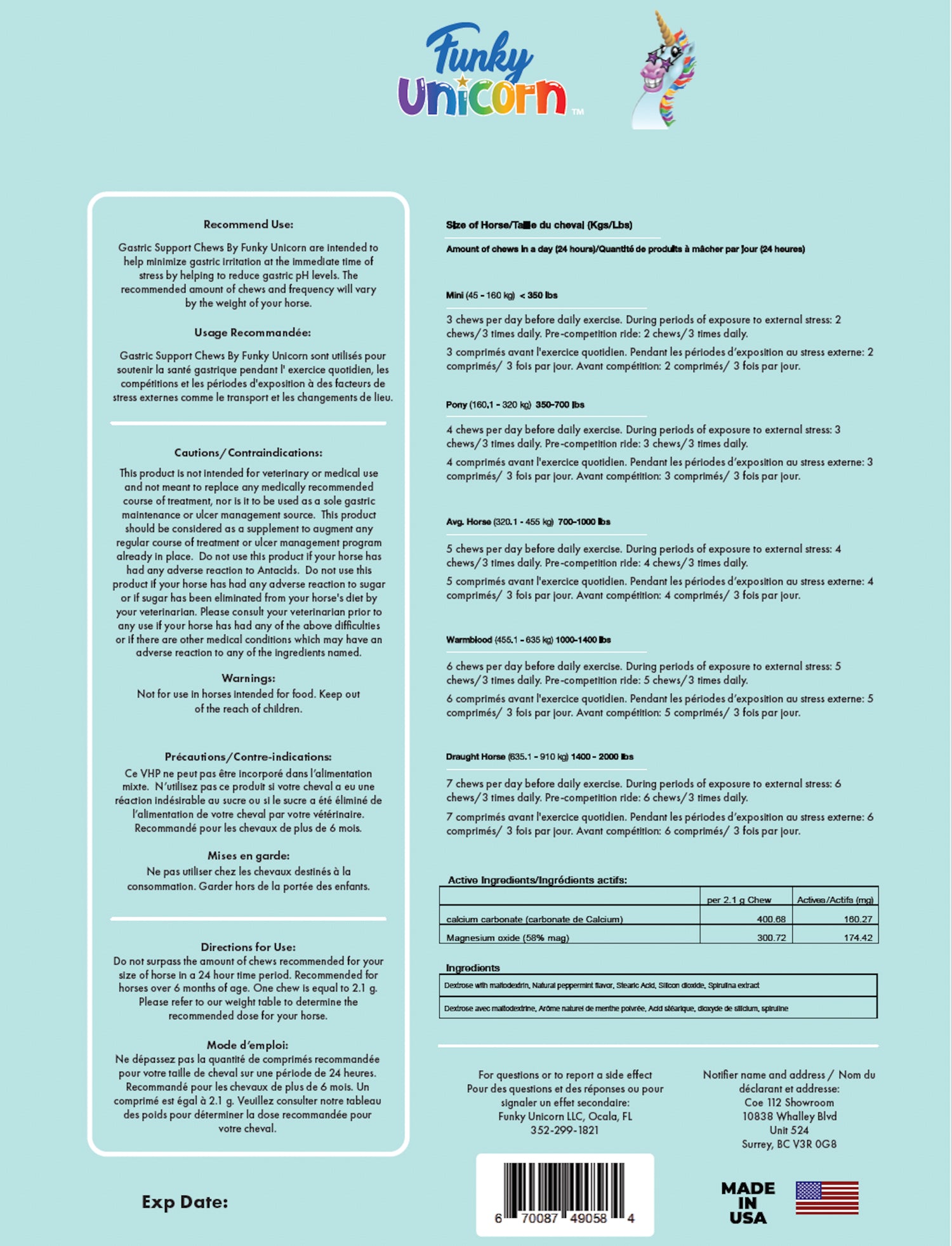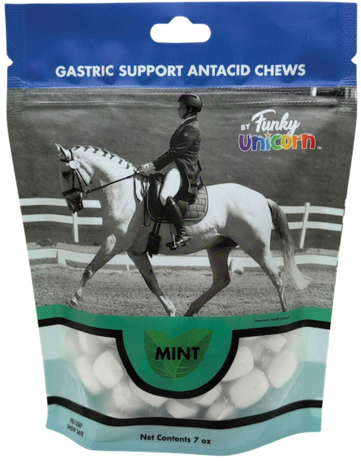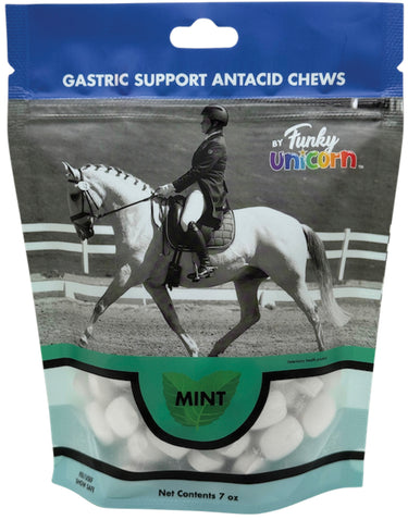 Funky Unicorn Gastric Support Antacid Chews start working by neutralizing stomach acid on contact. They provide a safe, tasty, effective and convenient way to soothe your horses stomach when stress from shipping, being ridden, changing locations or an alteration in their eating habits. Gastric Support Antacid Chews were created by an FEI veterinarian for the specific purpose of helping to buffer and calm your horse's stomach. Gastric Support Antacid Chews are to be utilized in addition to current gastric maintenance/treatment that is in place. Always confer with your veterinarian for concerns or for further recommendations.