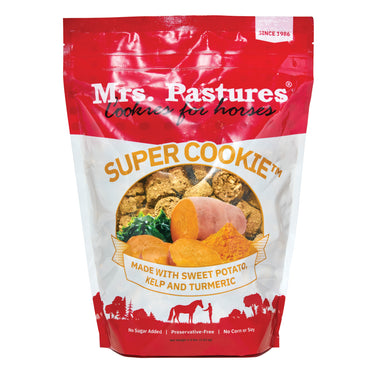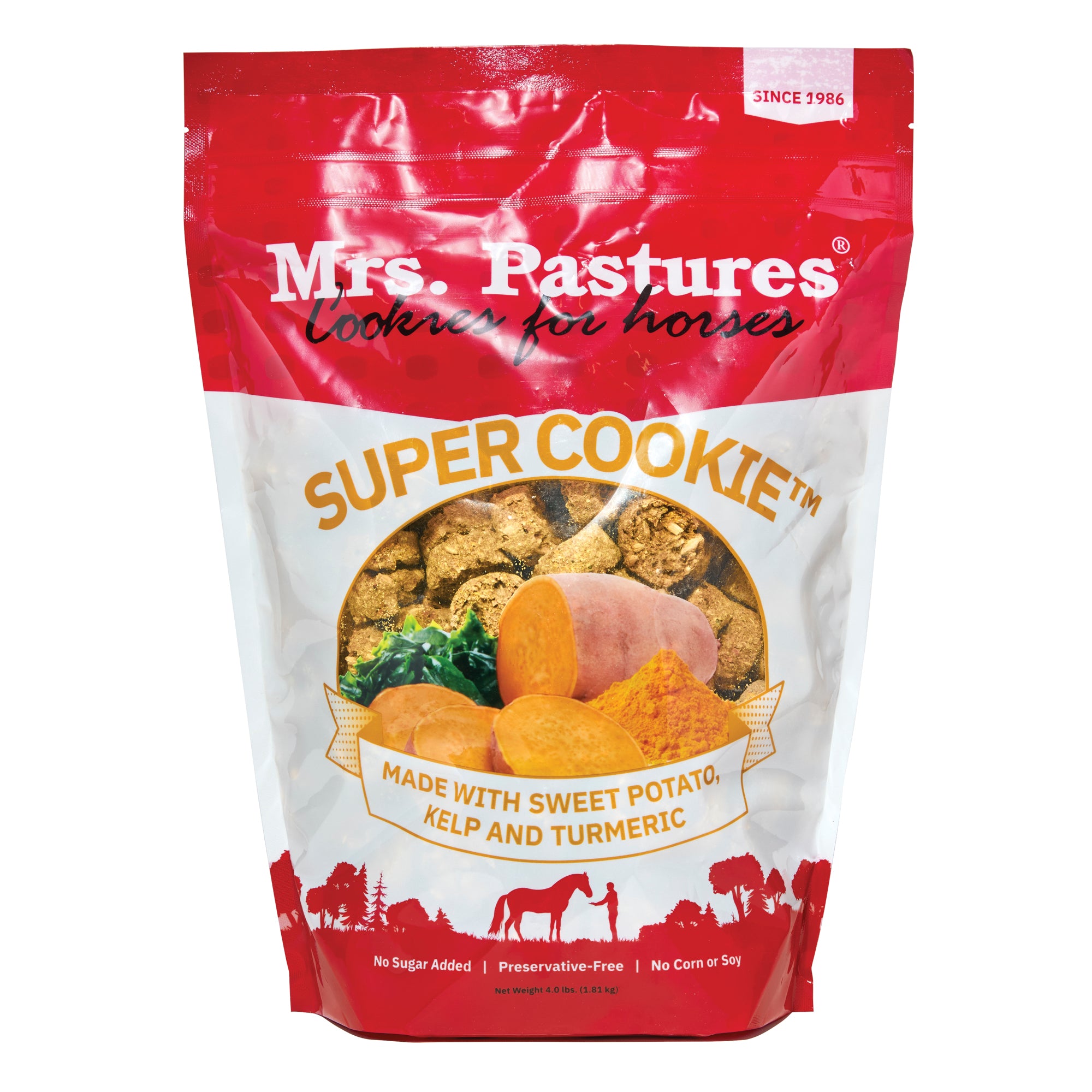 Introducing the Mrs. Pastures Super Cookie! Our new recipe is made with the same time-tested process as the original Mrs. Pastures horse cookie. We are proud to now offer an additional cookie option for your horse that is made with no molasses or other added sugar. Featuring sweet potatoes, turmeric and kelp—super foods for a Super Cookie! This new recipe is sure to become a barn favorite.