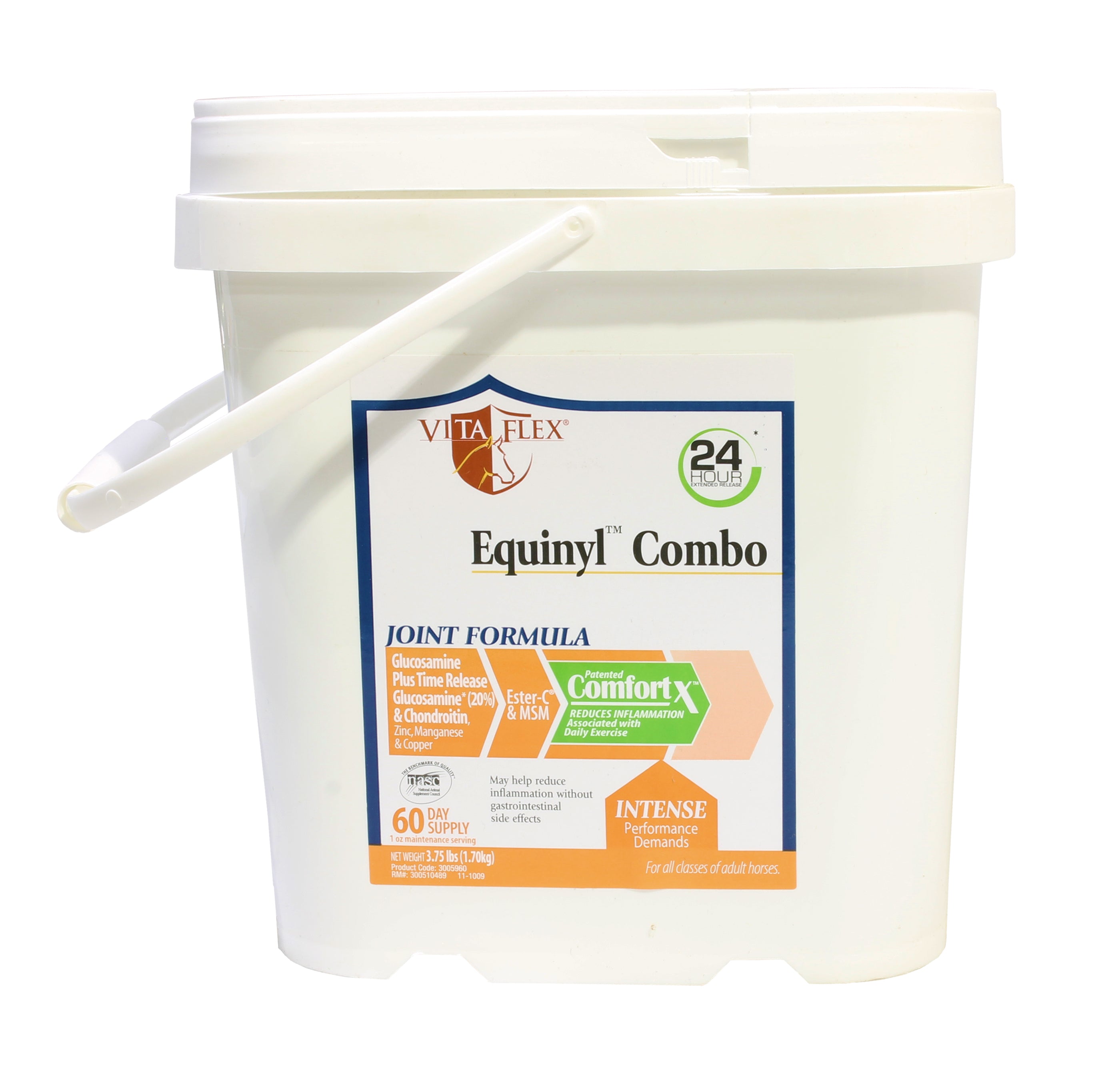 Vita Flex® Equinyl™ Combo is designed to help ease pain and inflammation associated with training and competition without causing gastrointestinal side effects. This supplement provides joint health support and increases flexibility. It shortens recovery time by reducing the emigration of neutrophils to the site of the inflammation. Contains glucosamine, which helps maintain synovial fluid that lubricates the joints for all day pain associated with daily exercise and activity. 5,000 mg glucosamine, 875 mg chondroitin. 7500 mg MSM. 3.75 lb (60-day supply).