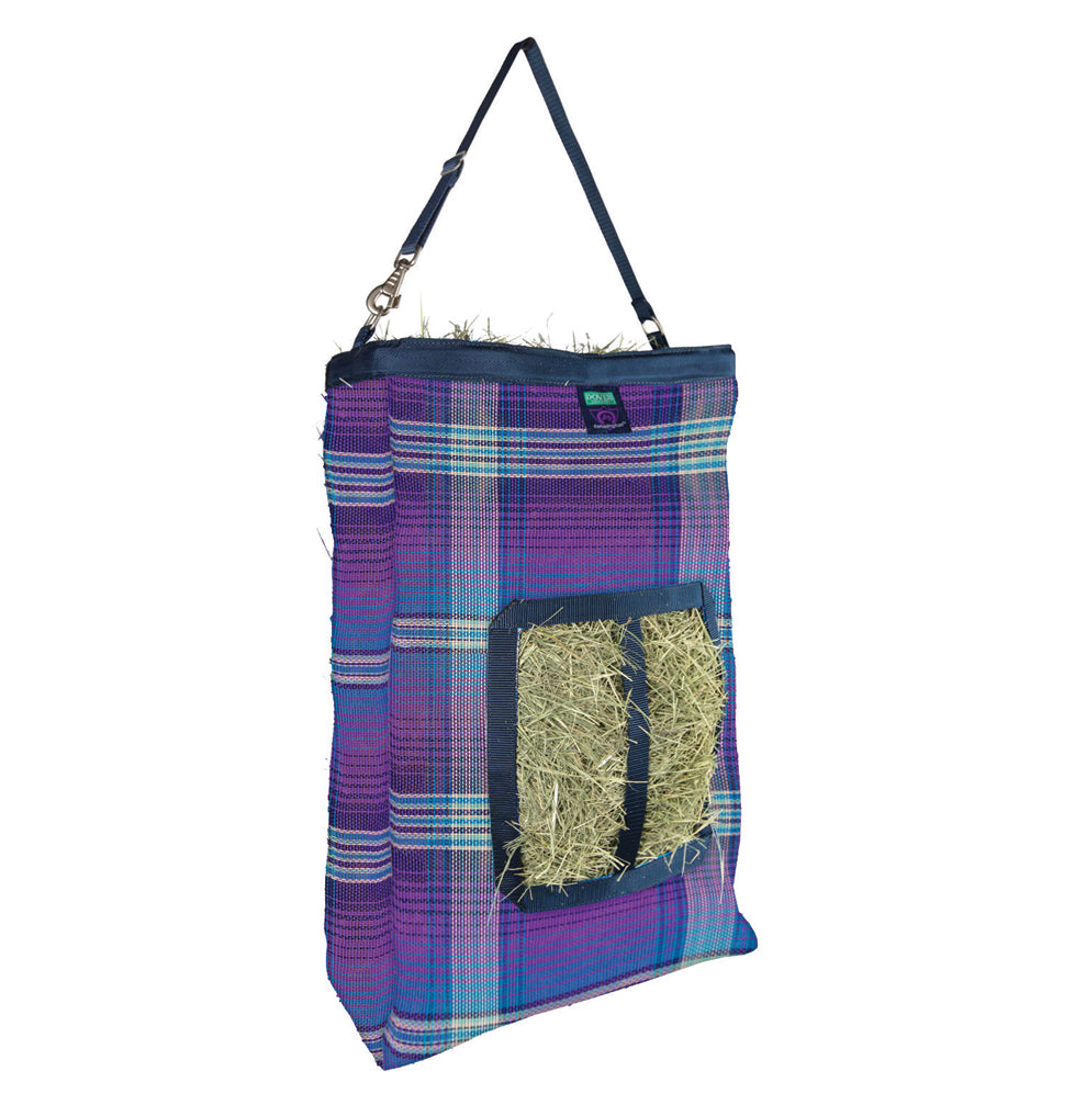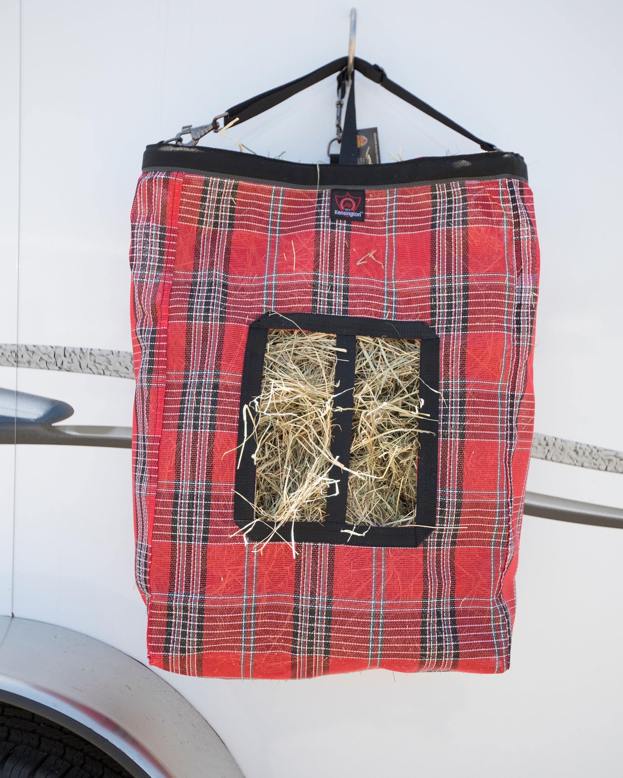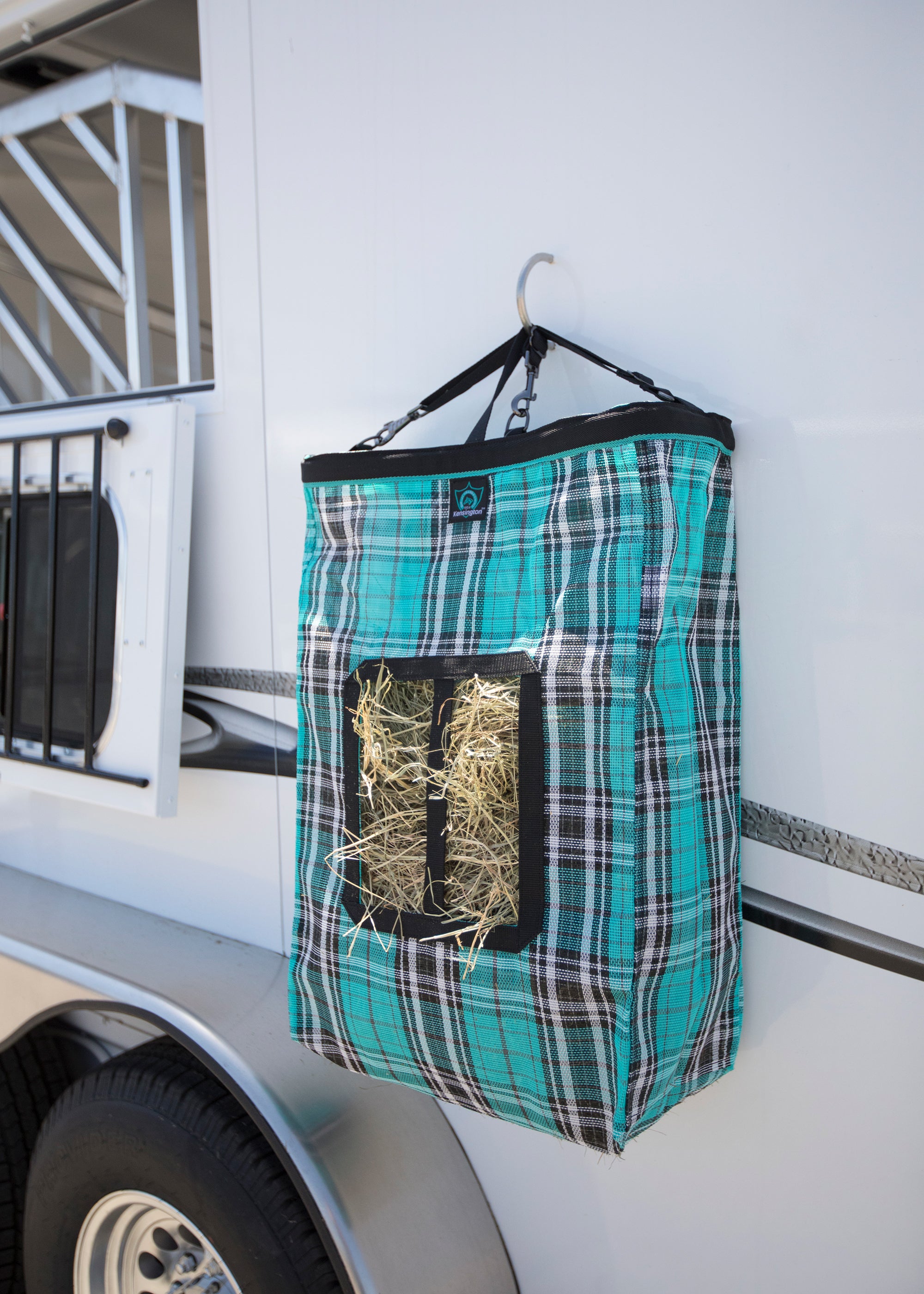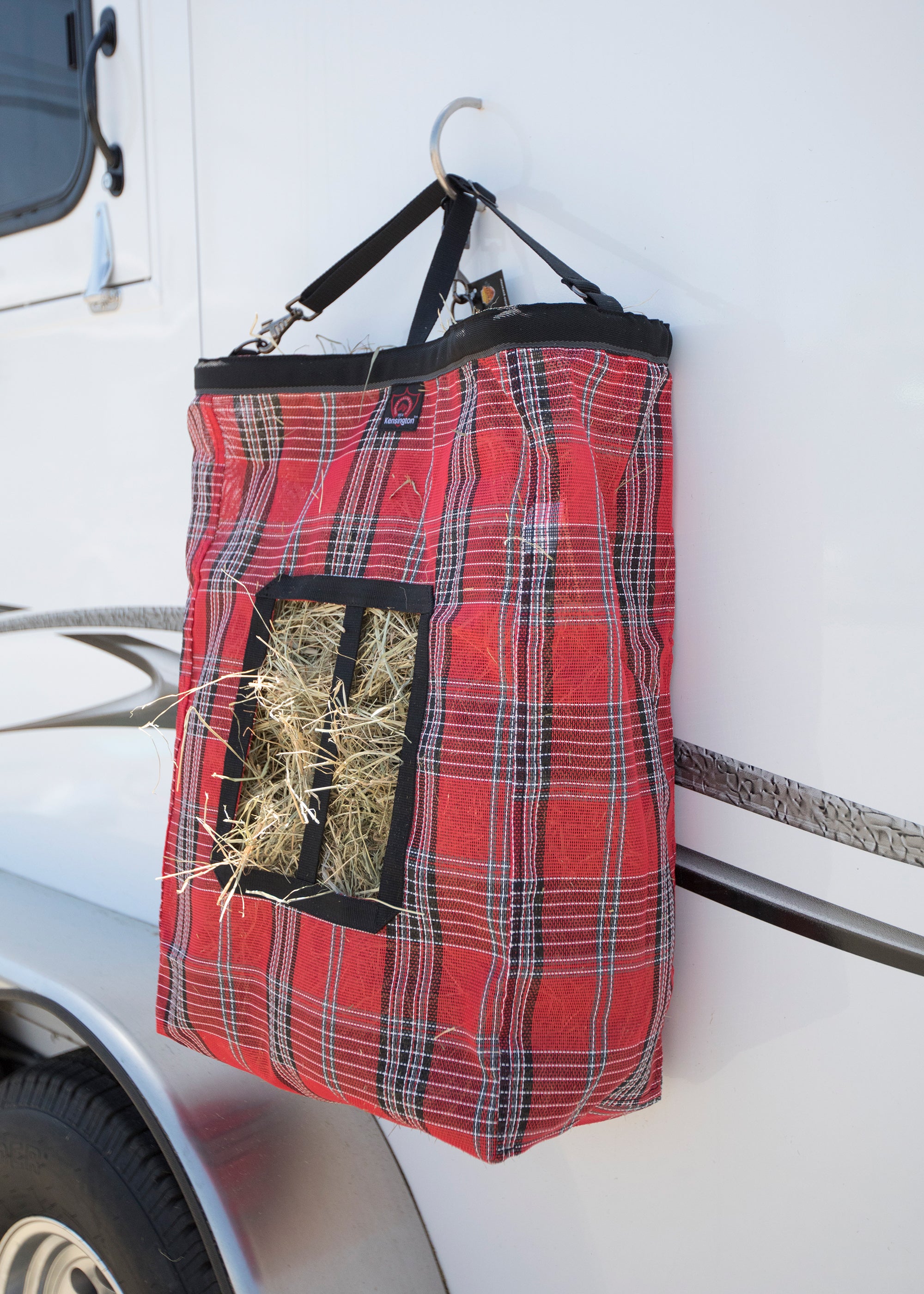 Perfect for trailer or show, this Kensington™ Hay Bag holds two large flakes of hay. Made of Textilene® all-weather woven PVC-coated polyester. Plastic rim with nylon webbing along top makes filling easy. Adjustable nylon strap and swivel snap for hanging or carrying.