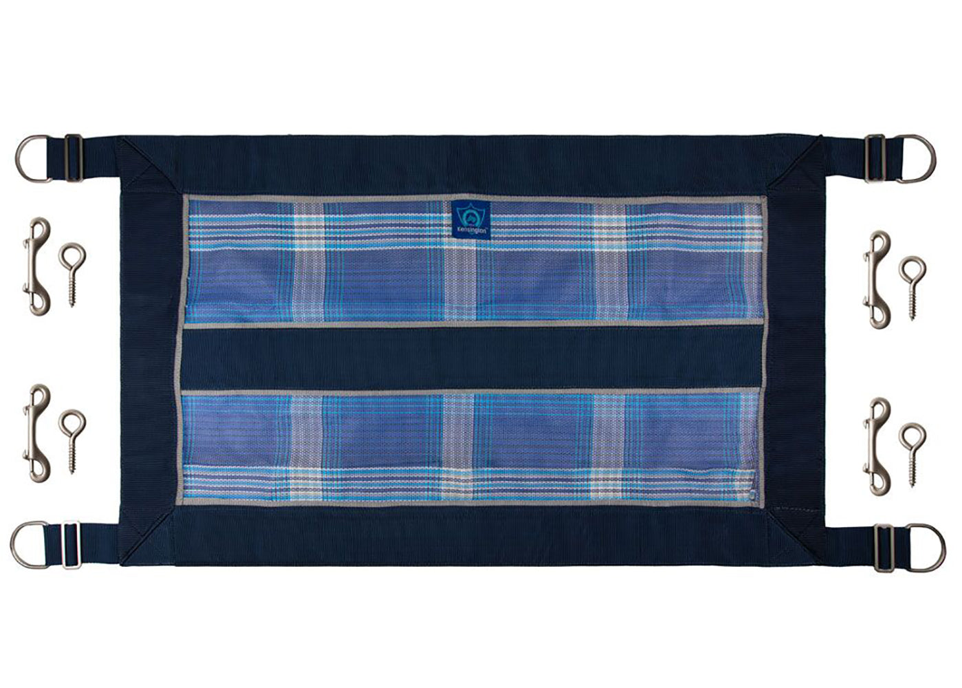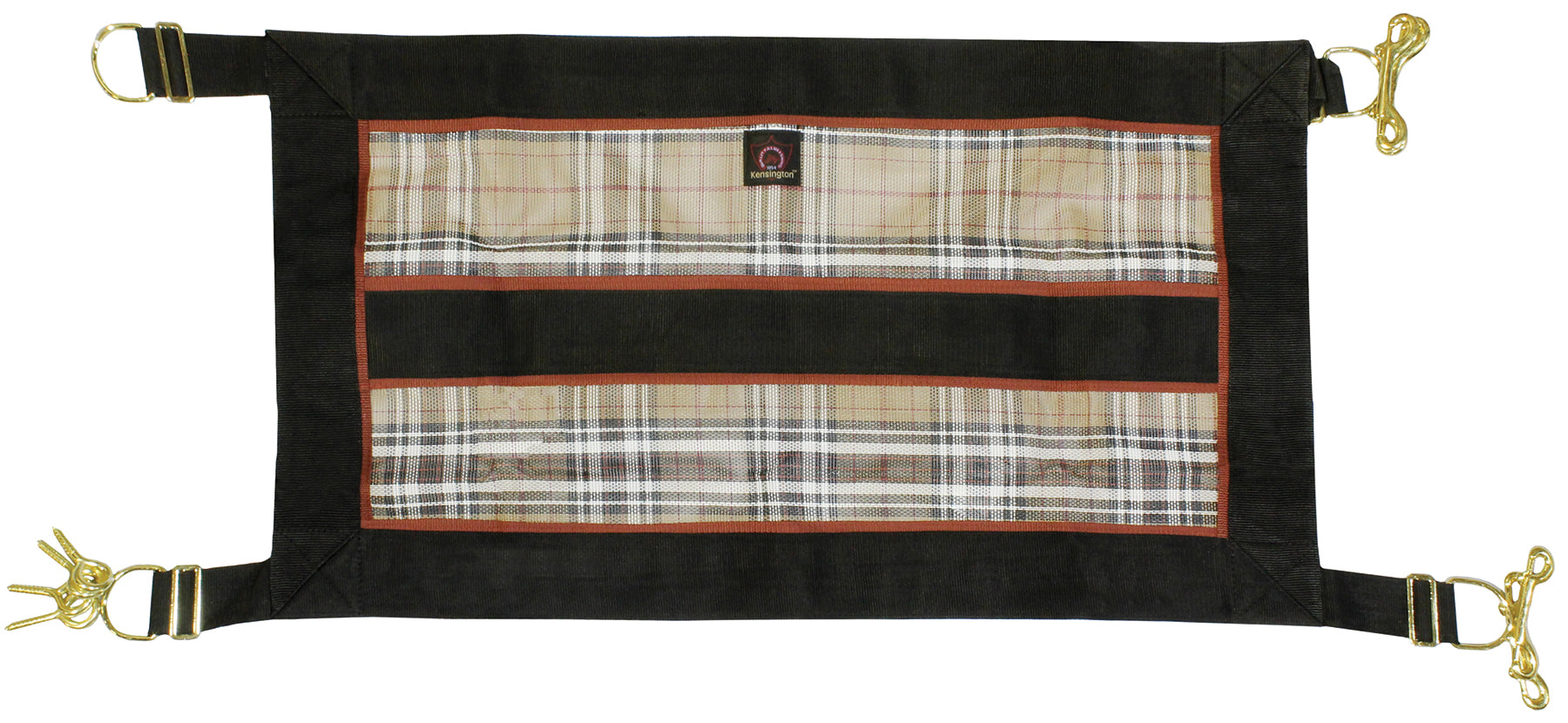 Kensington’s Stall Guard adds a touch of elegance to your stall door opening while it keeps your horse safely in the stall. Made of durable Textilene® mesh and bordered on all four sides with 3" nylon webbing, the guard is adjustable to fit openings up to 47" wide using the adjustment straps. Beautiful brass hardware completes the look and includes heavy-duty D-rings for easy fastening, double ended snaps and screw eyes for attaching to the barn door. The solid web center is ideal for personalization with a monogram.