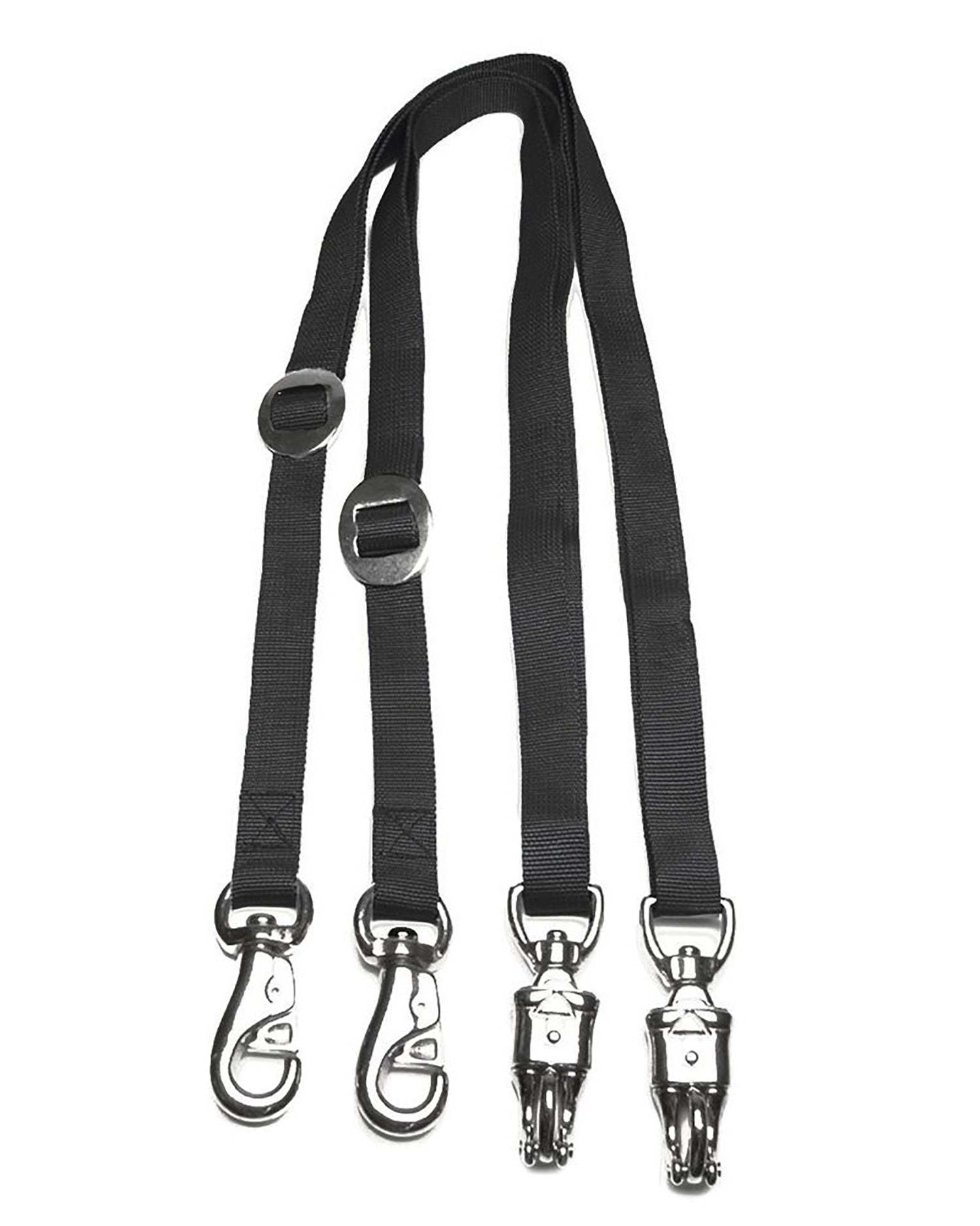 These Nylon Web Cross Ties are made of 1" wide heavy-duty poly web with bull snap and panic snap ends. Adjusts from 40" to 84" long. Set of 2.