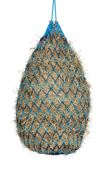 The Shires Deluxe Hay Net in extra-strong mesh holds 10 flakes (approximately 40 pounds). Metal rings at the top help this large hay net stay open for filling. A single large metal ring at the base provides support. Synthetic mesh has 2" feeding holes to reduce hay waste and slow your horse’s rate of consumption so hay lasts longer.