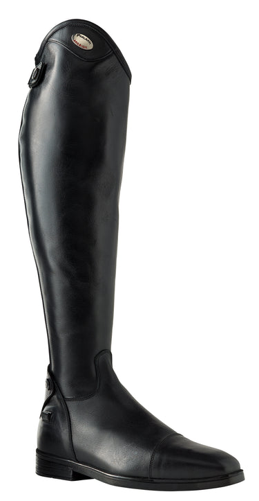 The Parlanti Denver Tall Dress Boot for ladies and men is handcrafted from exceptionally soft leather that molds to the leg immediately for a second-skin feel and practically no break-in period. Due to the nature of this leather, this boot is best suited for use in the show ring, not for everyday use. It's shaped for an elegant, profiled fit. A rear elastic insert allows it to be snug, yet comfortable against the leg. The back zipper has zipper protection at the base and a top snap keeper. Style features include dual spur holders, a plain toe cap and high Spanish top with metal logo plaque. It’s fully lined and constructed with a glued and stitched rubber sole.