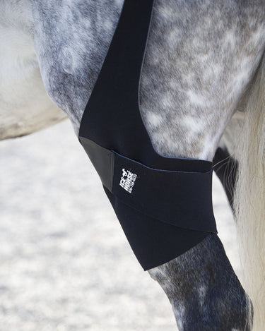 The adjustable suspender strap hangs over rump to support the wraps. Includes two stifle wraps with suspender strap plus four Cold Capsule Inserts.
