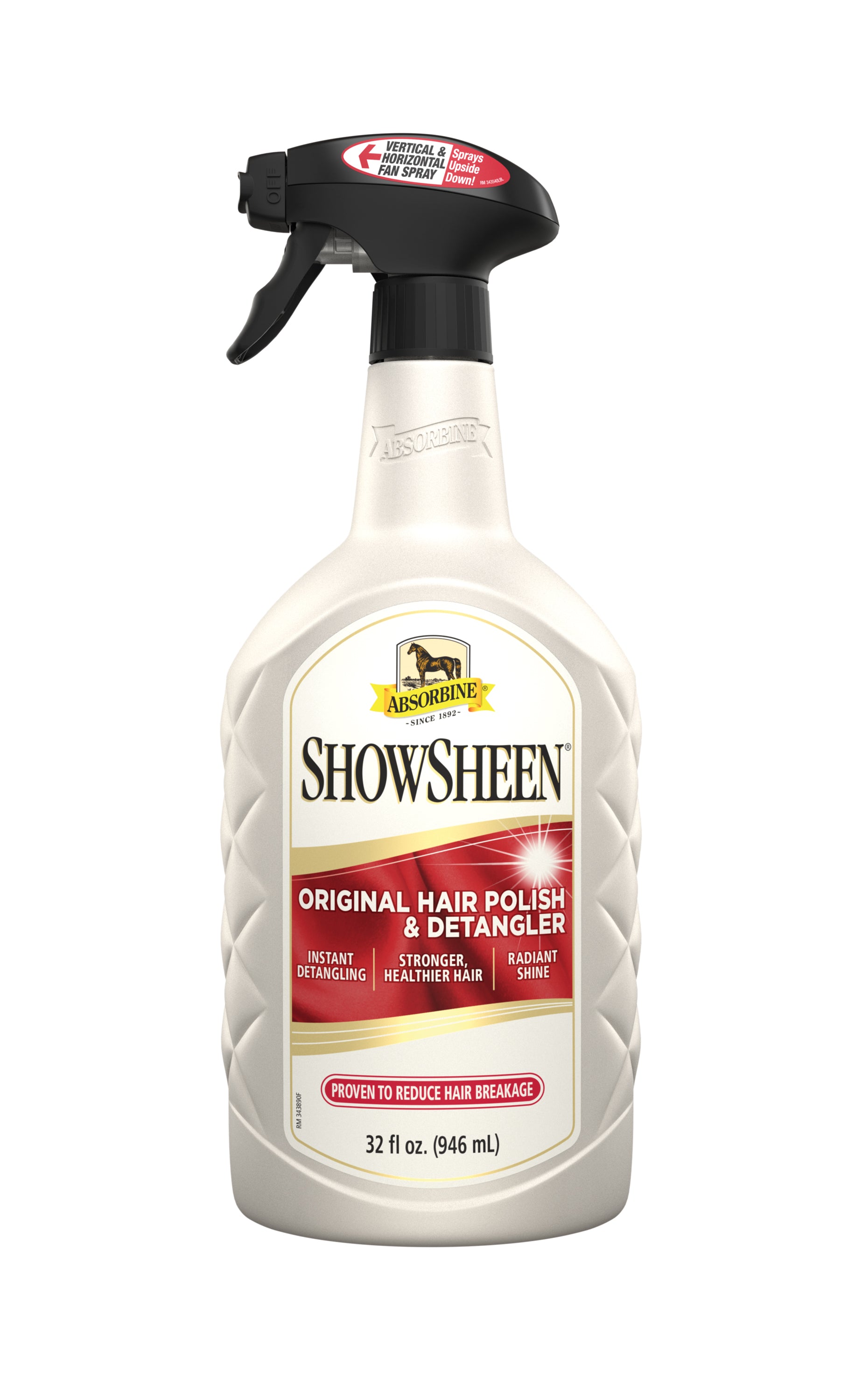 ShowSheen® Hair Polish & Detangler by Absorbine® adds a vibrant shine to your horse’s coat, mane and tail and instantly detangles long hair. Clinically proven to smooth hair, ShowSheen reduces grooming time by coating the hair shaft to prevent stains and the accumulation of dirt and grime. It is ideal when preparing for shows or special events as it keeps manes and tails tangle-free while imparting unparalleled shine.
