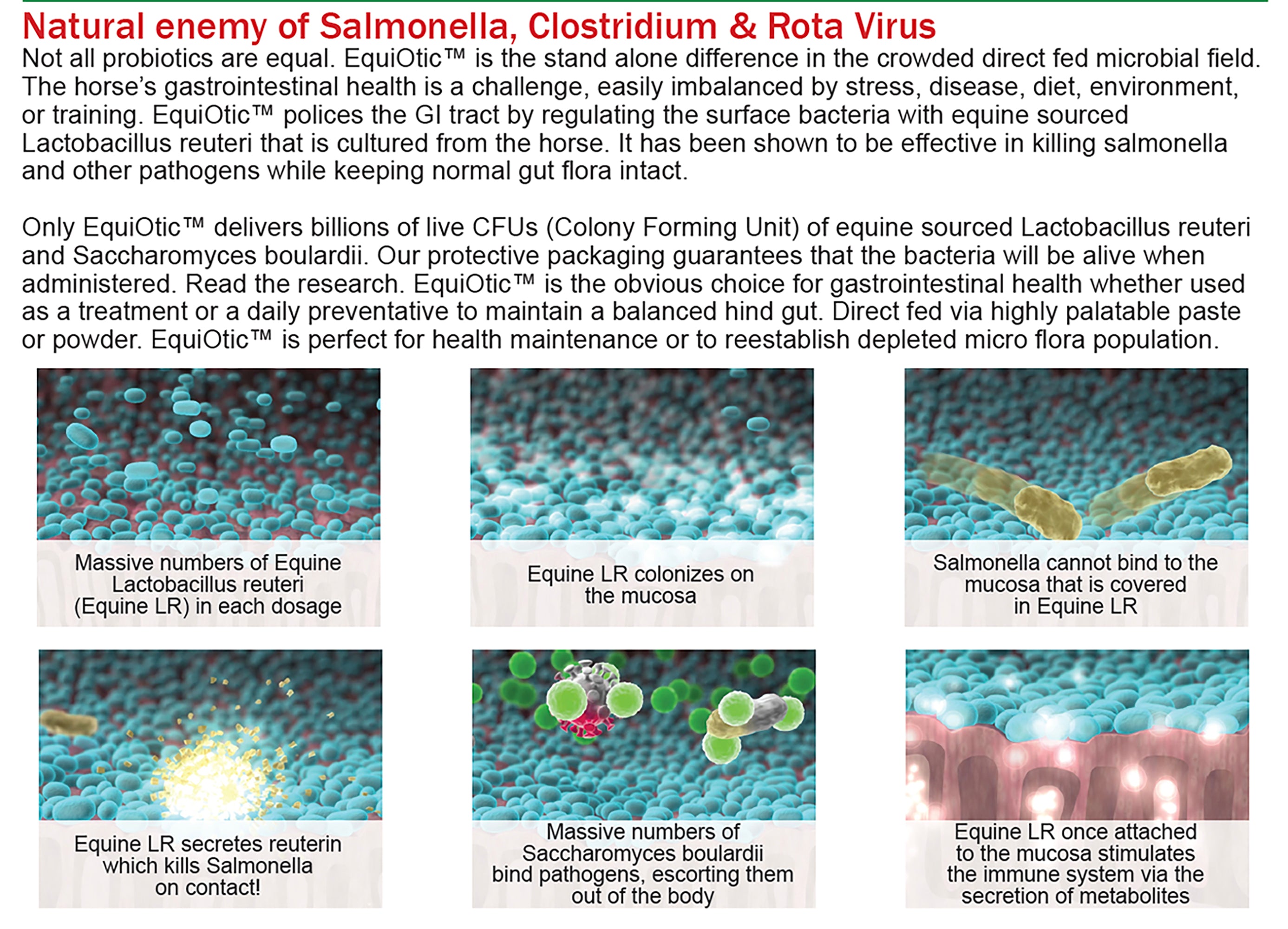 Because not all probiotics are equal, EquiOtic™ 60cc Syringe from Bluegrass Animal Products is the standalone difference in the crowded direct-fed microbial field. Maintaining a horse’s gastrointestinal health is a challenge as it is easily imbalanced by stress, disease, diet, environment, training and other factors. EquiOtic polices the horse’s gastrointestinal tract by regulating the surface bacteria with equine sourced Lactobacillus reuteri that is cultured from the horse, for the horse. It has been shown to be effective in killing salmonella, E. coli, rota virus and other pathogens, while keeping normal gut flora intact.