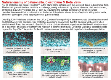 Only EquiOtic delivers billions of live CFU’s—the highest on the market—of equine sourced Lactobacillus reuteri. Protective packaging guarantees that the bacteria remain alive when administered. EquiOtic can be used as a treatment to help re-establish a depleted micro flora population or as a daily preventative added to feed to maintain a balanced hindgut. As an immuneprobiotic, this product joins the horseman’s arsenal of vaccination and deworming to form the triumvirate of horse care.