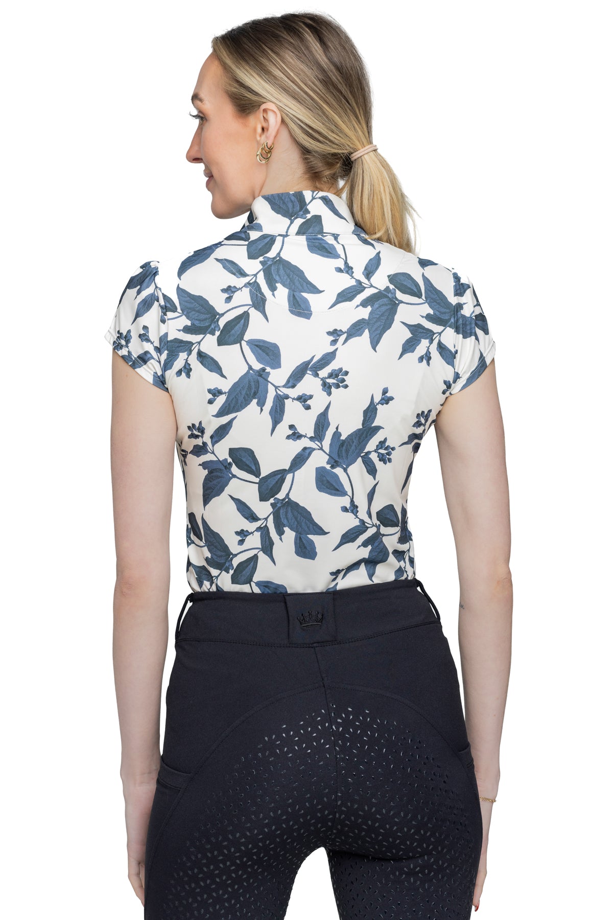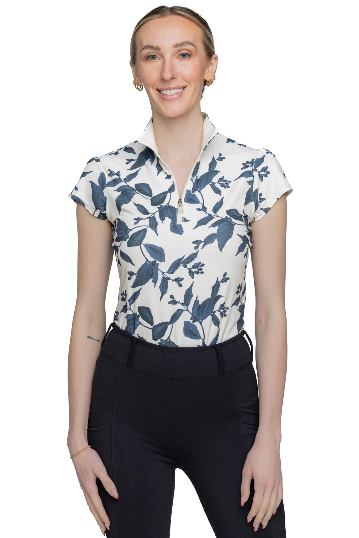 Rich shades of indigo and sporty white make our Kastel Denmark Jules Short Sleeve Shirt with lithograph leaf cap sleeve a stunner. Slightly shirred feminine cap sleeves, quarter-zip, UPF 30 and soft 4-way stretch fabric in a contemporary fit.