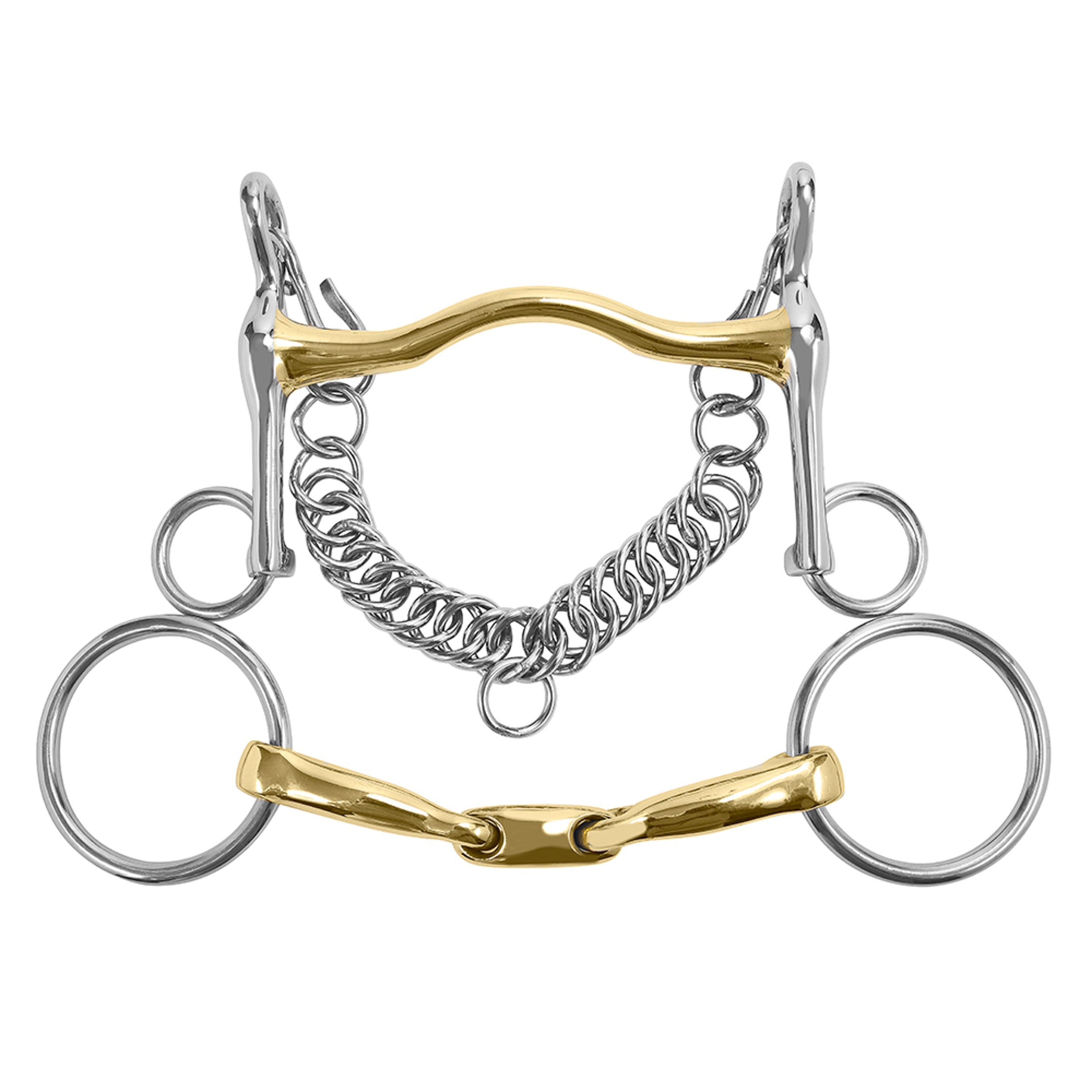The shorter shanks on the curb bit create a faster response with less leverage as compared to a longer shank curb. Mouthpiece is 12mm thick; shanks are 5cm long. Curb chain is included. The bradoon has a 14mm mouthpiece and 55mm loose rings.